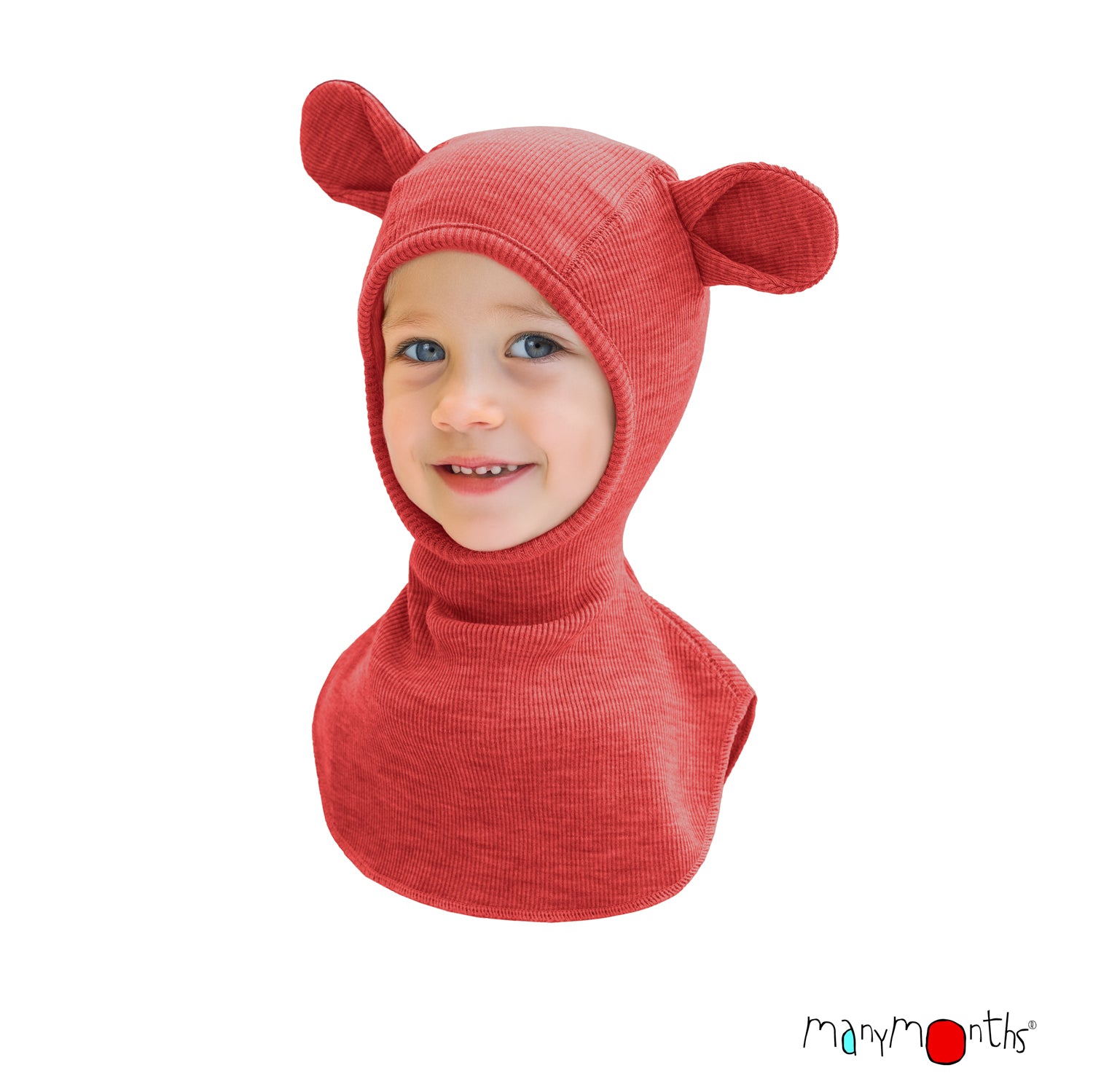 Cagoule en laine mérinos de la collection "Unique" de ManyMonths, version "Teddy Bear", avec des oreilles d'ourson : apporte au quotidien une touche d'originalité et de fun à la tenue de votre enfant qu'il soit petit ou grand. Son côté rigolo peut aussi vaincre les réticences de certains enfants à porter une cagoule !