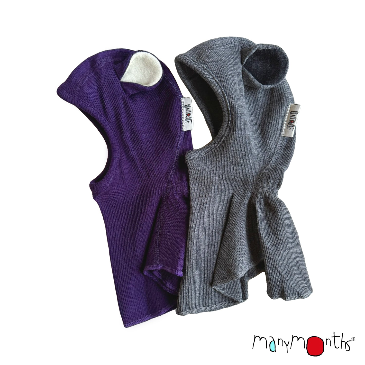 Composition : Cagoule confectionnée en 100% laine mérinos. Laine garantie sans mulesing, produite dans le respect de l'animal. Tissu spécialement conçu pour ManyMonths design.