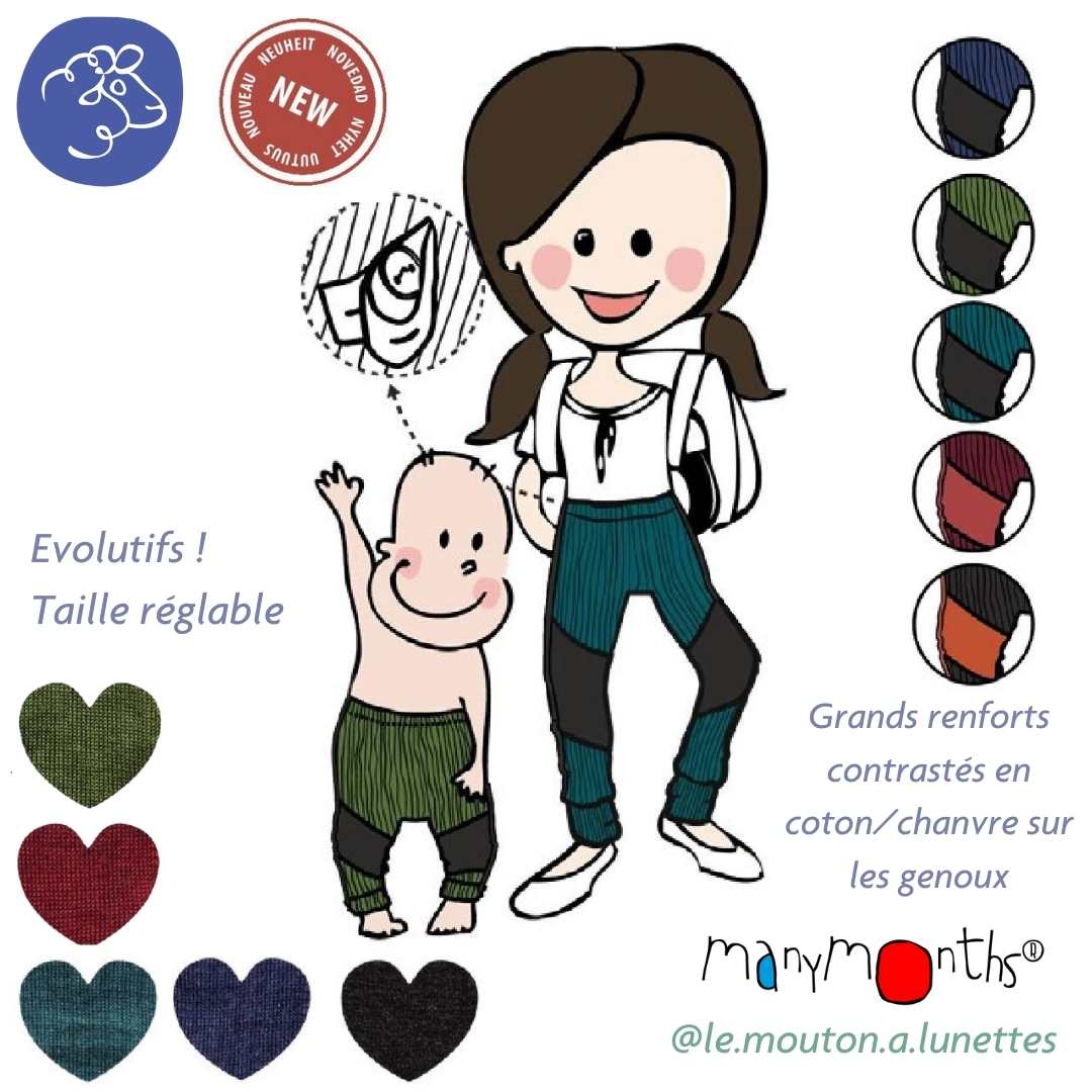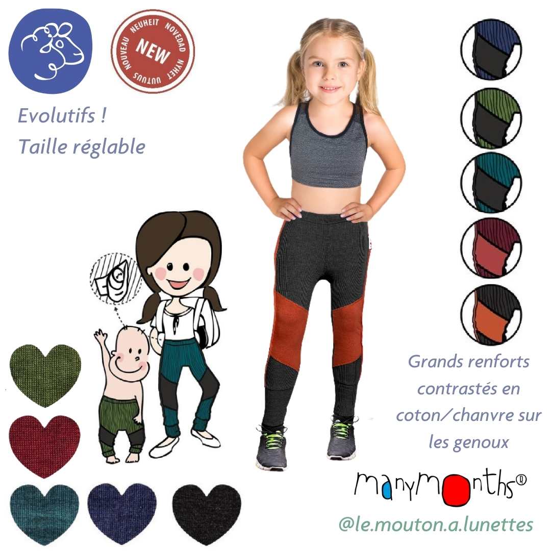 Version Sport des leggings évolutifs en pure laine mérinos ManyMonths. Développés par le fabricant suite à la demande de nombreux clients, cette version sera particulièrement appréciée des enfants actifs, que ce soit pour les jeux de plein air ou en salle, les activités de montagne, vélo, ski, etc, ou pour le quotidien à l'école en forêt.
