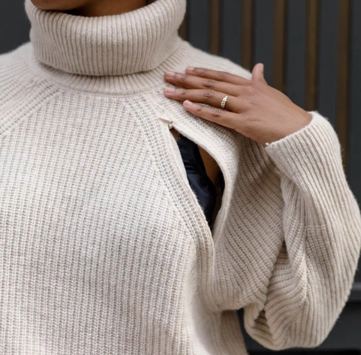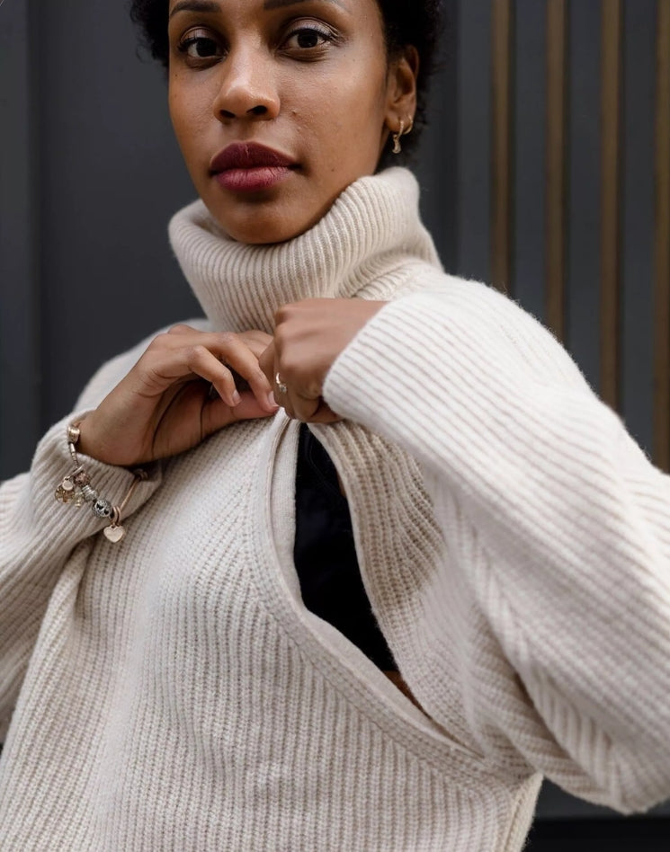 Un pull d'allaitement à col roulé comme un vrai doudou moelleux, pour allaiter confortablement et bien au chaud !