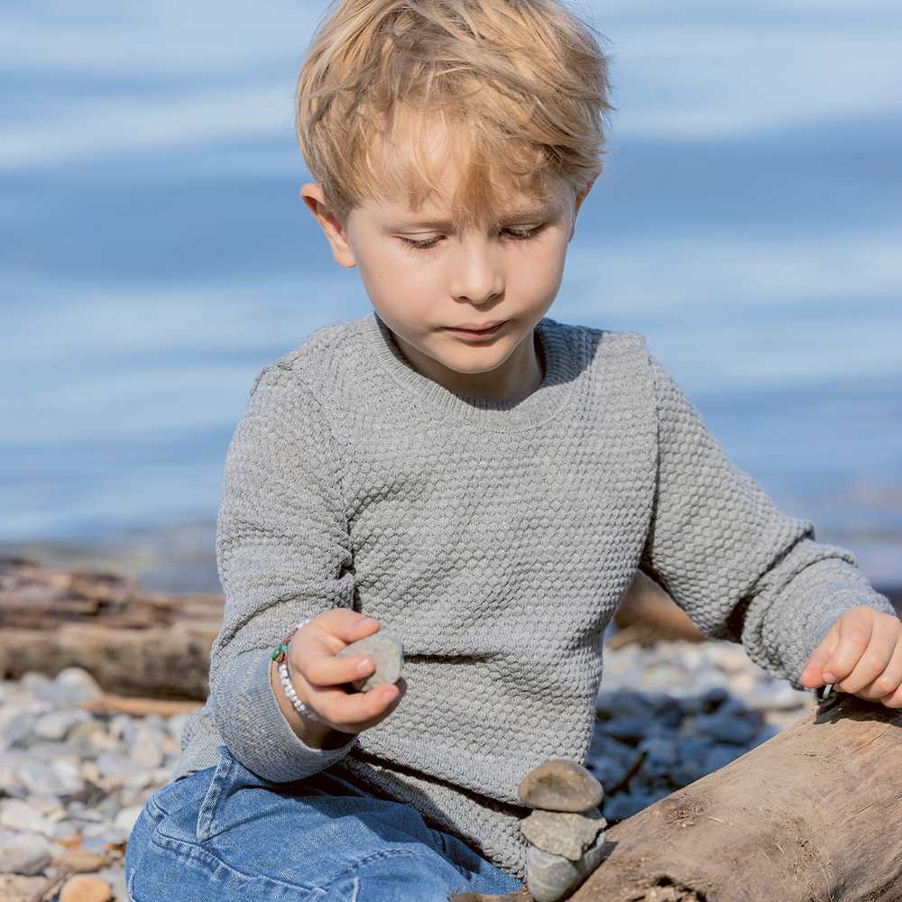 Pullover Disana pour enfant tricoté 100% laine vierge mérinos bio, labellisé GOTS et IVN BEST. Fabriqué en Allemagne dans le propre atelier de l'entreprise.