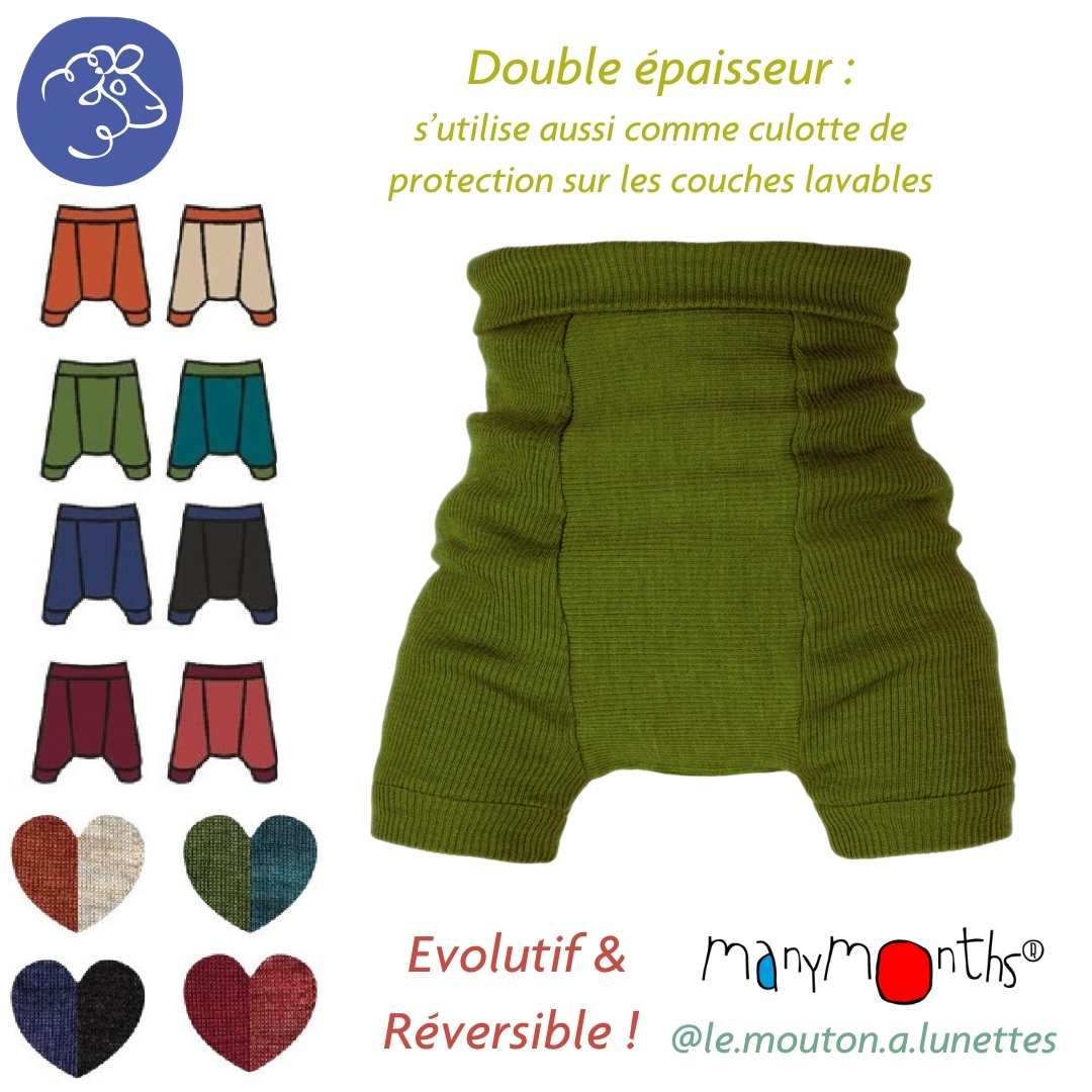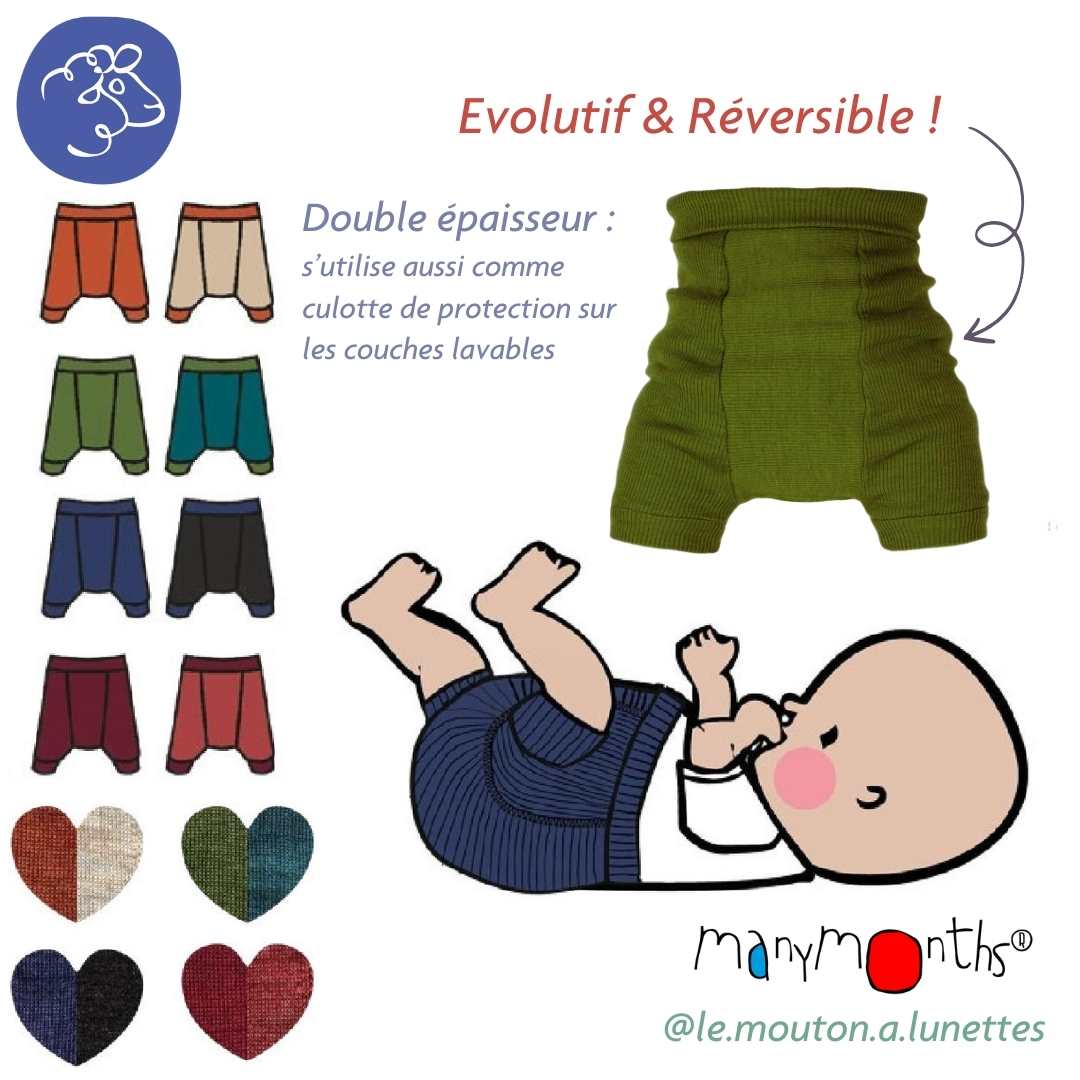 Une culotte de protection bébé polyvalente, réversible et évolutive de la marque Manymonths : bien épais en laine mérinos thermorégulatrice, ce shorty en laine garantit confort et bien-être à bébé.