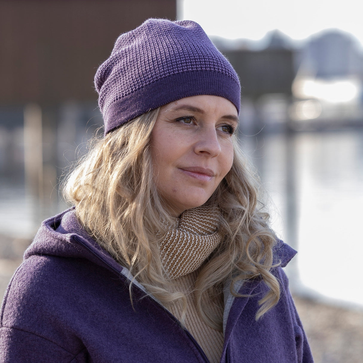 - Matière saine et thermorégulatrice : la laine régule naturellement la température, et la fibre de mérinos est si fine qu'elle ne gratte pas.