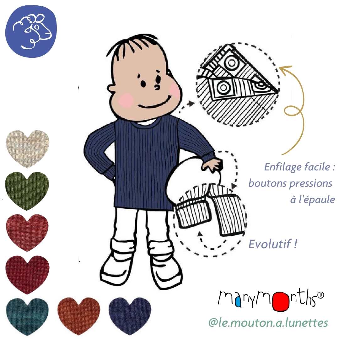 Ce t-shirt manches longues Manymonths en pure laine mérinos est le grand classique basique disponible en de nombreuses tailles et toutes les couleurs (et aussi pour adulte et ado ici). Détail pratique : il s'ouvre sur une épaule avec des boutons pressions discrets, pour un enfilage très facile.