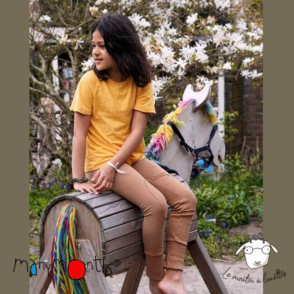 Ces leggings évolutifs sont fabriqués en jersey de coton biologique, tricoté en côtes (extensible). Les bords-côtes aux chevilles sont en coton bio (95%) et élasthanne (5%)